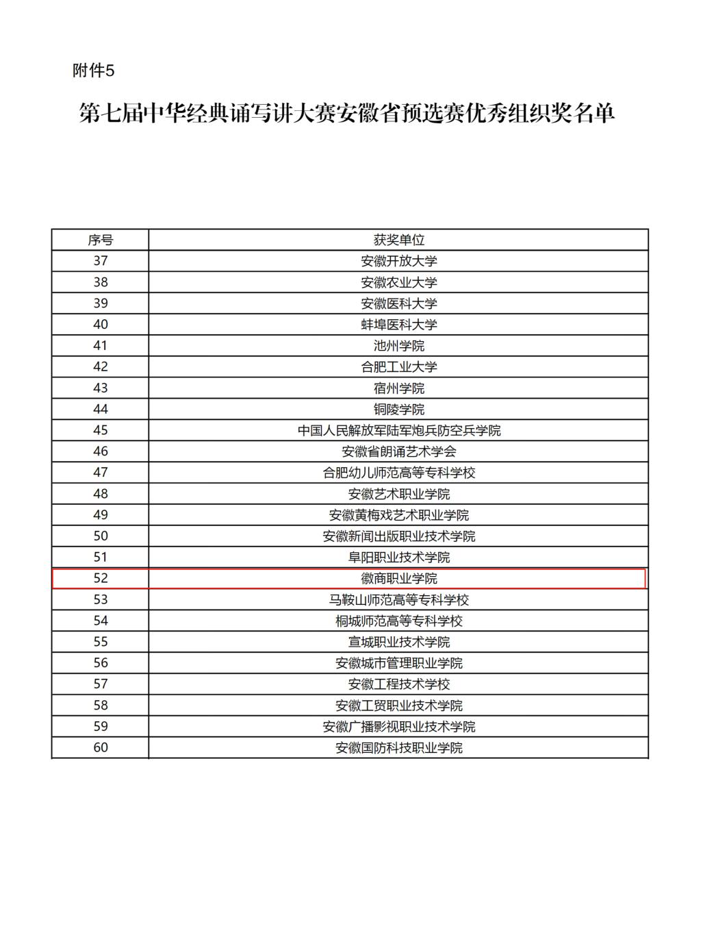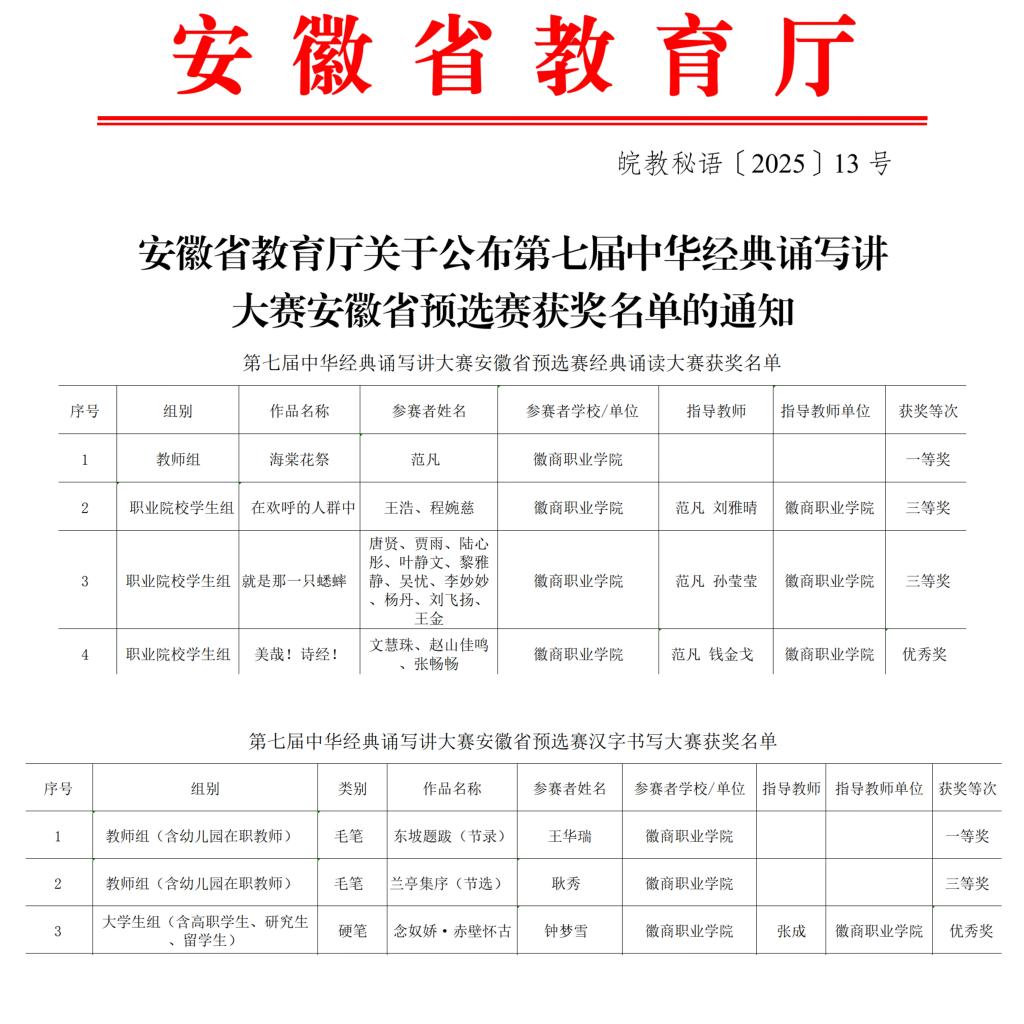 近日,安徽省教育厅公布了第七届中华经典诵写讲大赛安徽省预选赛获奖名单,学院报送的作品荣获诵读类赛项一等奖1项并入围国赛,三等奖2项,优秀奖1项;荣获书写类赛项一等奖1项并入围国赛,三等奖1项,优秀奖1项。此外,因组织有力,成绩突出,学院荣获优秀组织奖。