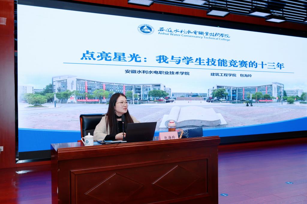 2025年度全省教书育人楷模、安徽水利水电职业技术学院包海玲老师以《点亮星光:我与学生技能竞赛的十三年》为主题,围绕“学院为梦筑摇篮、砥砺前行争先锋、服务学生践初心、继往开来启新程”四个方面,用生动的案例、真挚的情感,为我们讲述了她深耕职业教育十三载的动人故事。从自费攻坚新技术到赛场夺冠后即刻融入教学,从建立复盘手册指导学生到推动“技能创业”,每一个细节都彰显着她对教育事业的赤诚、对技能育人的执着。这份“学透、练熟、想明白”的治学态度,这份“师德为基、技能为要”的育人理念,让她坚守育人初心,在教学、竞赛和科研中发力,成为学生成长路上的引路人。