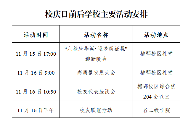 六秩薪传,再谱华章。60周年校庆,是我校发展史上的重要里程碑,更是全体徽院人赓续初心、勇毅前行的新起点。学校将11月10日—16日定为校庆活动周,并于11月15日17:00在槽郢校区礼堂举行“六秩庆华诞・逐梦新征程”迎新晚会,11月16日9:00在槽郢校区礼堂举行高质量发展大会,11月16日下午各二级学院开展校友联谊活动。