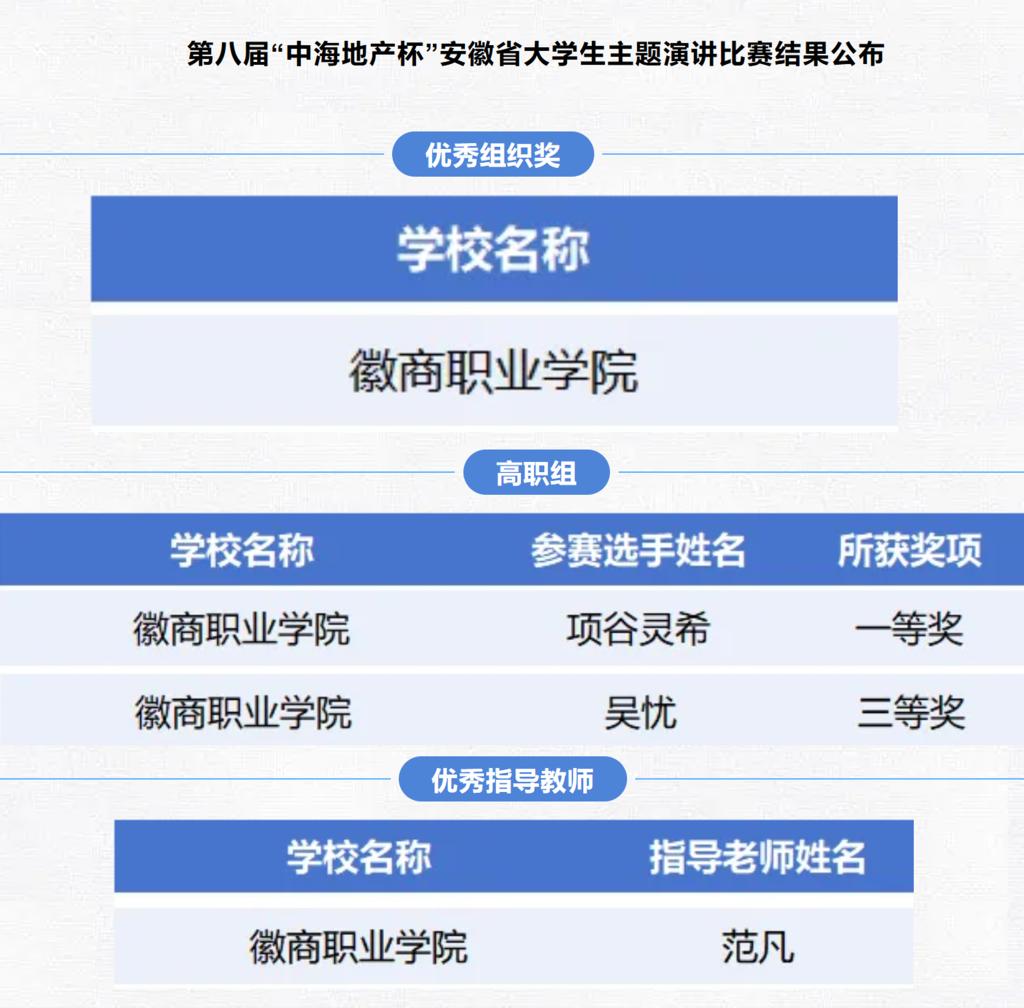 近日,由共青团安徽省委员会、安徽省教育厅、安徽省学生联合会联合主办的第八届“中海地产杯”安徽省大学生主题演讲比赛圆满收官。我校选手表现优异,获得一等奖1项、三等奖1项,范凡老师获“优秀指导教师”称号,学校荣获“优秀组织奖”,实现了个人奖+指导奖+组织奖的全丰收。