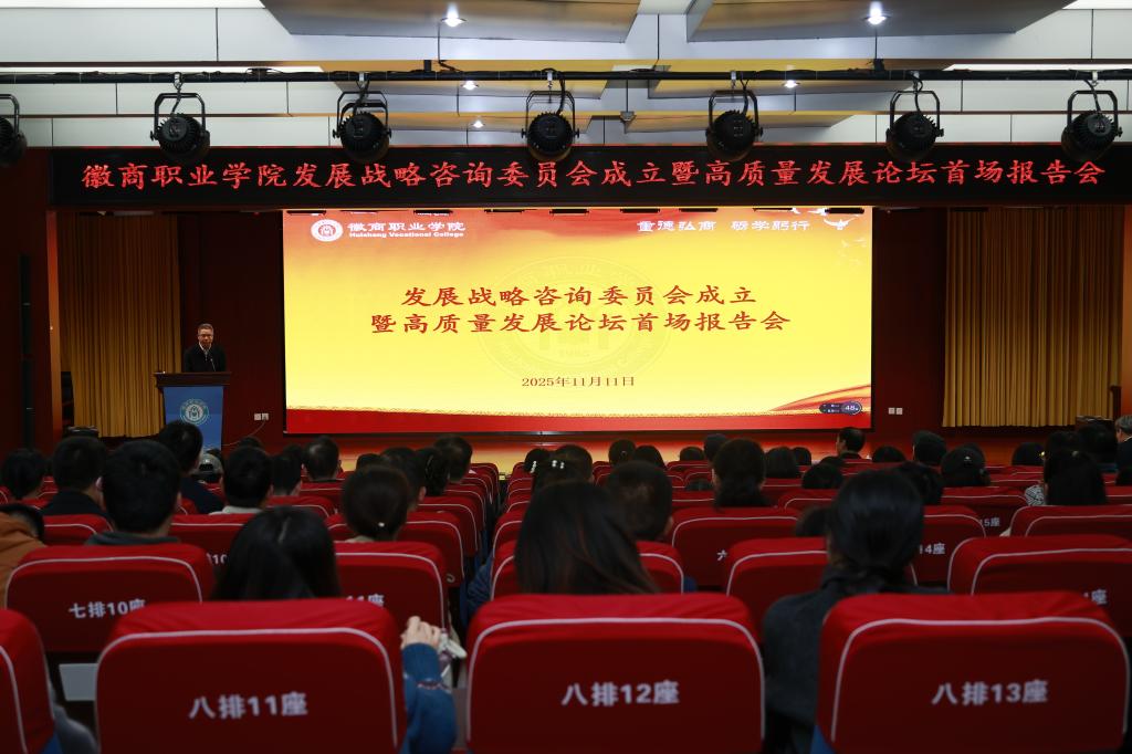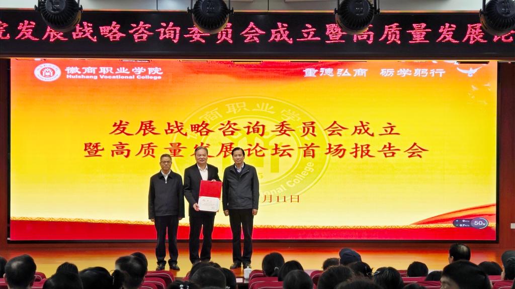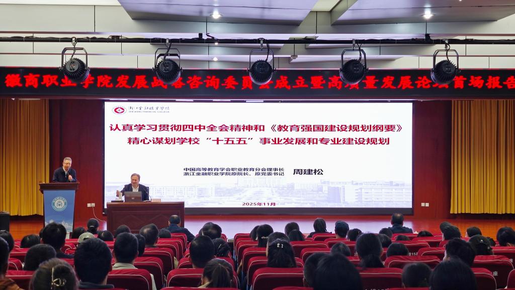 11月11日下午,学校在紫蓬校区举行高质量发展论坛报告会。本次报告会既是党的二十届四中全会精神专题宣讲,也是建校60周年校庆系列活动之一。会议特邀中国高等教育学会职业教育分会理事长、浙江金融职业学院原院长、原党委书记周建松作专题报告,并聘其为学校发展战略咨询委员会第一届主任委员。校领导班子成员出席,全体教职工参会,报告会由校党委书记陈春来主持。