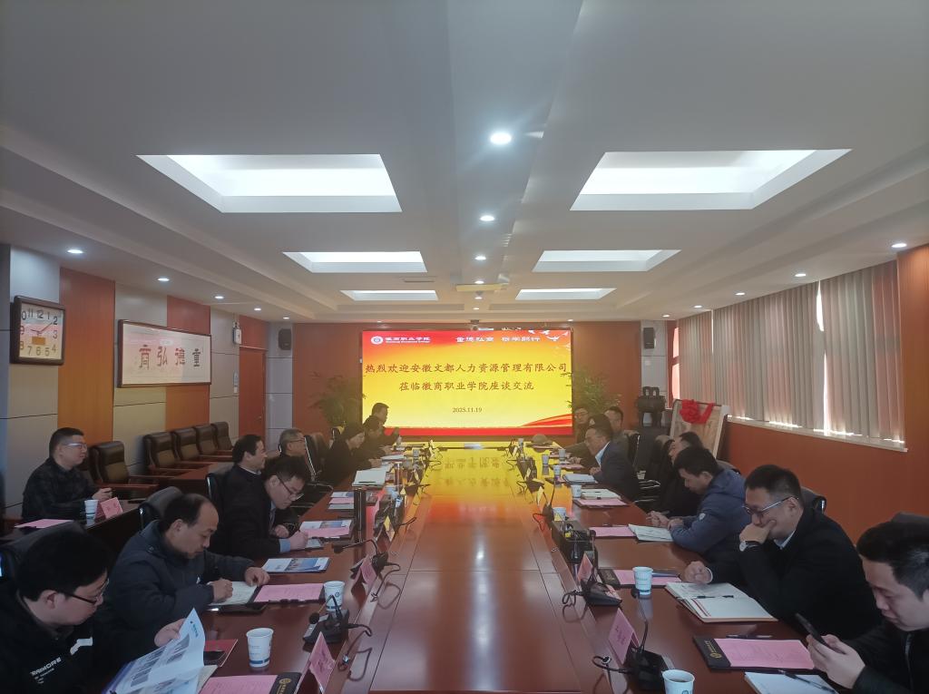 2025年11月19日上午,安徽文都人力资源管理有限公司董事长袁中福、总裁张贤勇一行来校调研交流。校党委书记陈春来,党委副书记、校长丁仁船,副校长王方出席交流会。