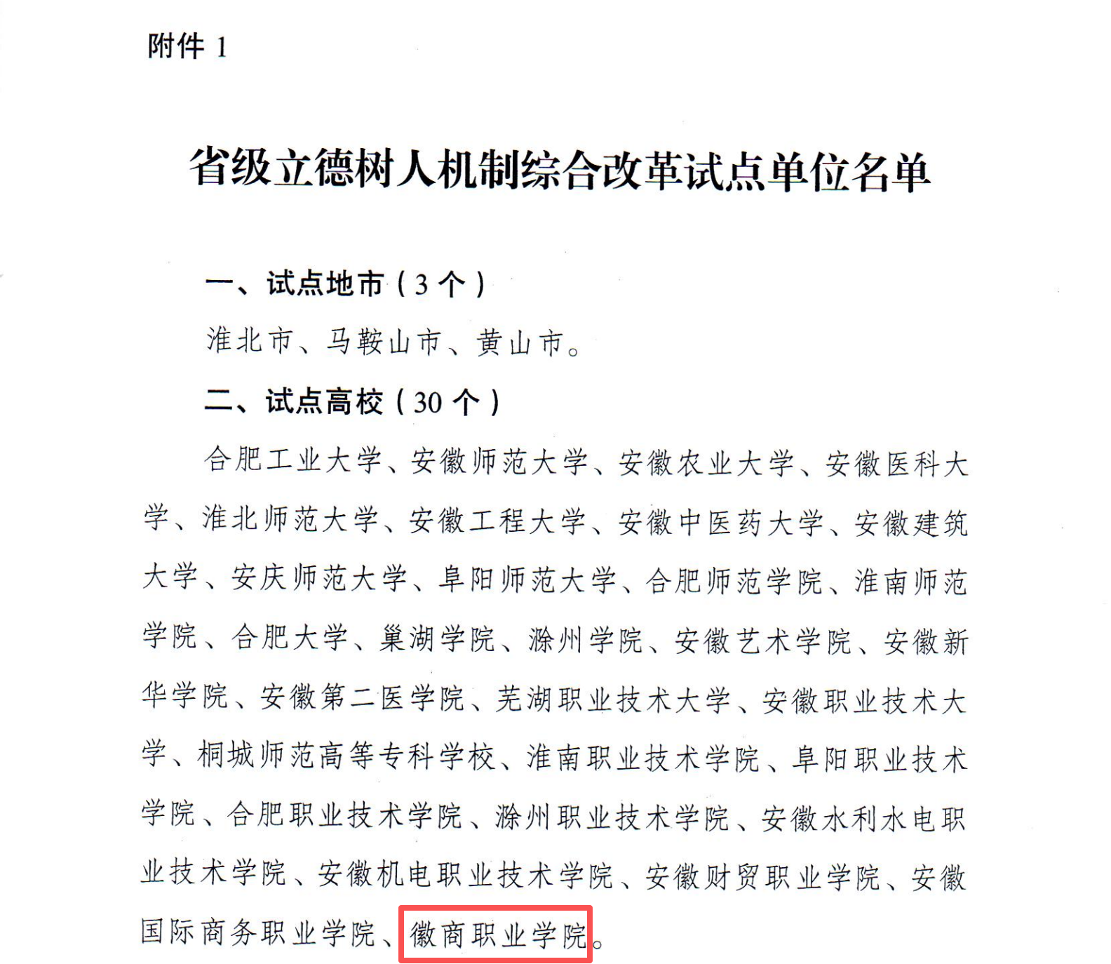 近日,中共安徽省委教育工作领导小组秘书组、中共安徽省委教育工委联合发布省级立德树人机制综合改革试点单位名单,我校成功入选省级立德树人机制综合改革试点高校。