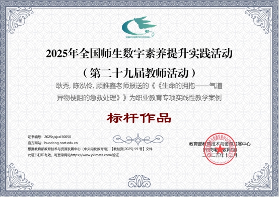 近日,2025年全国师生数字素养提升实践活动(第二十九届教师活动)评选结果揭晓,学校耿秀、陈泓伶、顾雅鑫老师团队报送的《生命的拥抱——气道异物梗阻的急救处理》,在全国30个省区市遴选提交的2699件职业教育专项作品中脱颖而出,获评职业教育专项实践性教学案例标杆作品。
