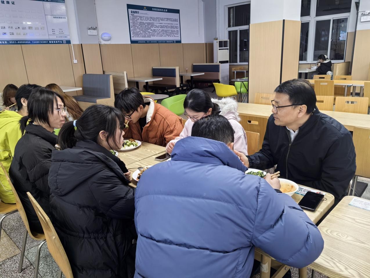 课后,吴红星与25级无人机应用技术班的同学们一起排队打饭,共进晚餐。用餐期间,与同学们围坐在一起,亲切询问大家的饮食习惯、家庭情况、在校开销以及对食堂菜品的意见建议。餐桌上,没有严肃的会议氛围,只有轻松的闲聊与真诚的关怀。领导仔细了解同学们的生活细节,叮嘱大家要注意营养均衡、加强锻炼、保持健康体魄。一顿简单的晚餐,拉近了学校领导与普通学子的距离,让同学们感受到了家人般的温暖。