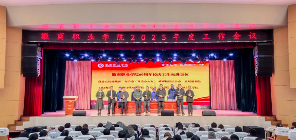 会上,吴红星宣读了《关于表彰徽商职业学院60周年校庆工作先进集体的决定》,学校领导为获奖集体颁发奖杯。王方受丁仁船校长委托,作学校2025年度工作总结。