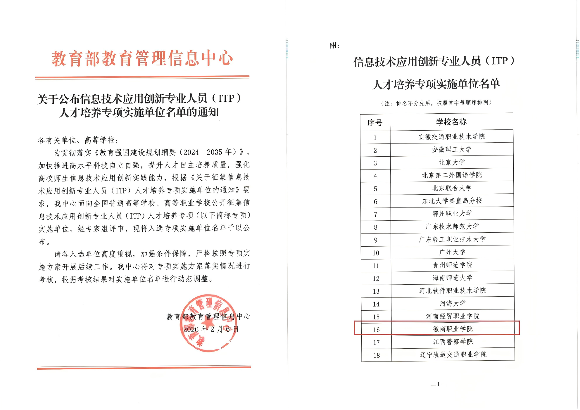 近日,教育部教育管理信息中心公布“信息技术应用创新专业人员(ITP)人才培养专项”实施单位名单,我校成功入选全国首批30所实施高校之列。