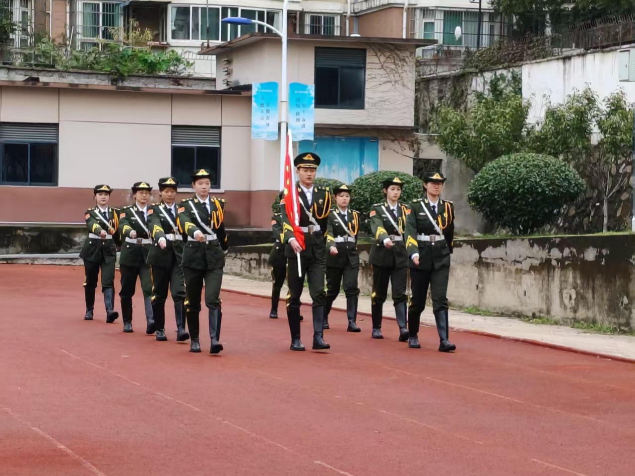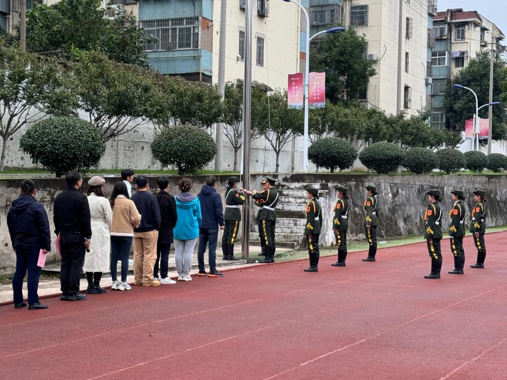 随着雄壮激昂的《义勇军进行曲》奏响,升旗仪式庄严启幕。由九名学生组成的国旗护卫队,步伐整齐划一,昂首阔步迈向升旗台。国旗缓缓升起,国歌嘹亮奏响,五星红旗在空中冉冉飘扬。全体师生肃立致敬,高声齐唱国歌,爱国之情与强国之志在心中澎湃激荡。