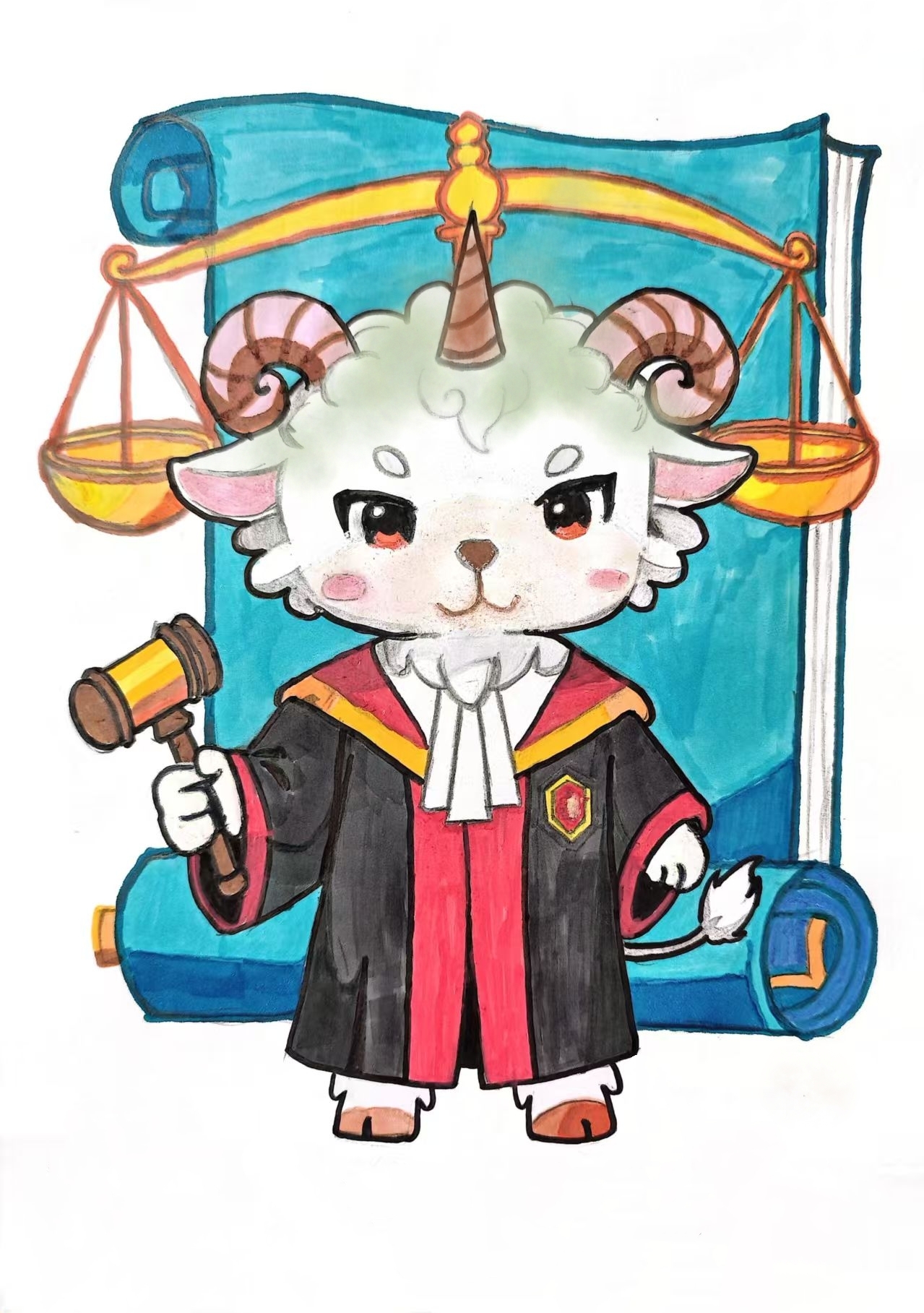 王浩宇同学选取“獬豸”作为创作原型,结合徽商职业学院法治教育特色设计出网络普法IP形象“獬小徽”。獬豸是中国古代神话中的神兽,身形似羊,额生独角。獬豸能辨是非曲直,能识善恶忠奸,被视为勇猛与司法公正的双重象征。“獬小徽”的形象以“獬豸”为基础,身着法官袍,手持法槌,背后是象征公平与正义的天平和法律文书。将IP设计成勇敢正义、憨态可掬的小神兽形象,使其在视觉上更加具有吸引力,让传统神兽形象更添文化底蕴与时代温度。