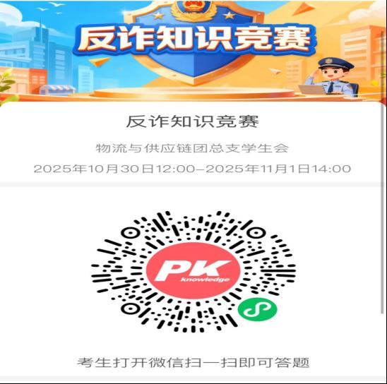 为增强大学生安全防范与维权意识,营造校园反诈防骗的浓厚氛围,物流与供应链学院于2025年10月30日12:00至11月1日14:00,举办了以“全民反诈,筑牢防线”为主题的线上反诈知识竞答活动。