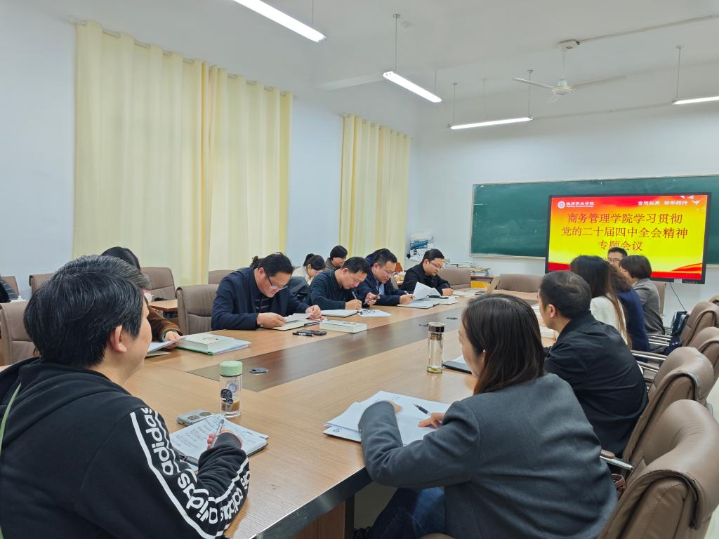 11月5日下午商务管理学院党总支召开专题会议,传达学习党的二十届四中全会精神,落实学校党委会会议精神,部署学院学习宣传贯彻工作。学院全体教职工参加会议。