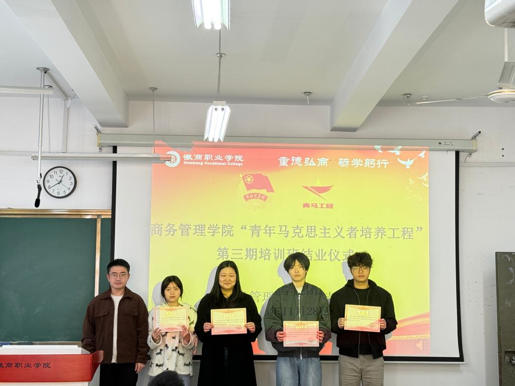 11月28日中午,商务管理学院在槽郢校区举办第三期“青马工程”培训班结业仪式。学院党总支副书记鲍骏、团总支书记李文、辅导员代表杨标和庞何心、第三期培训班全体学员参加,结业仪式由李文主持。