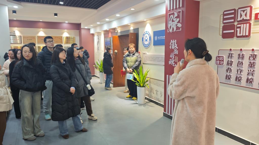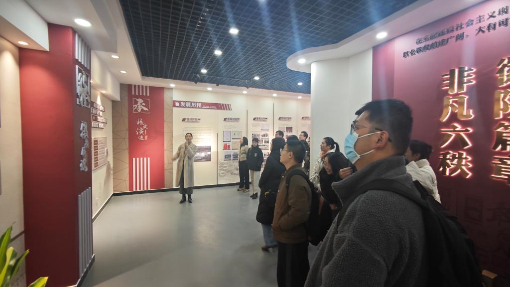 在讲解员王芹老师的带领下,大家依次参观了“脉・徽韵铸魂、承・校史演进、铸・品格实践、誉・新程担当”四大展区。馆内通过实物展品、图文资料、视频影像及数字互动等多种形式,系统呈现了学校自创办至今的奋斗历程,全面展示了在人才培养、教学科研、社会服务等方面取得的丰硕成果。参观过程中,大家认真聆听讲解,不时驻足观看、交流探讨,深刻感受到学校深耕职业教育、传承徽商精神的使命与担当。