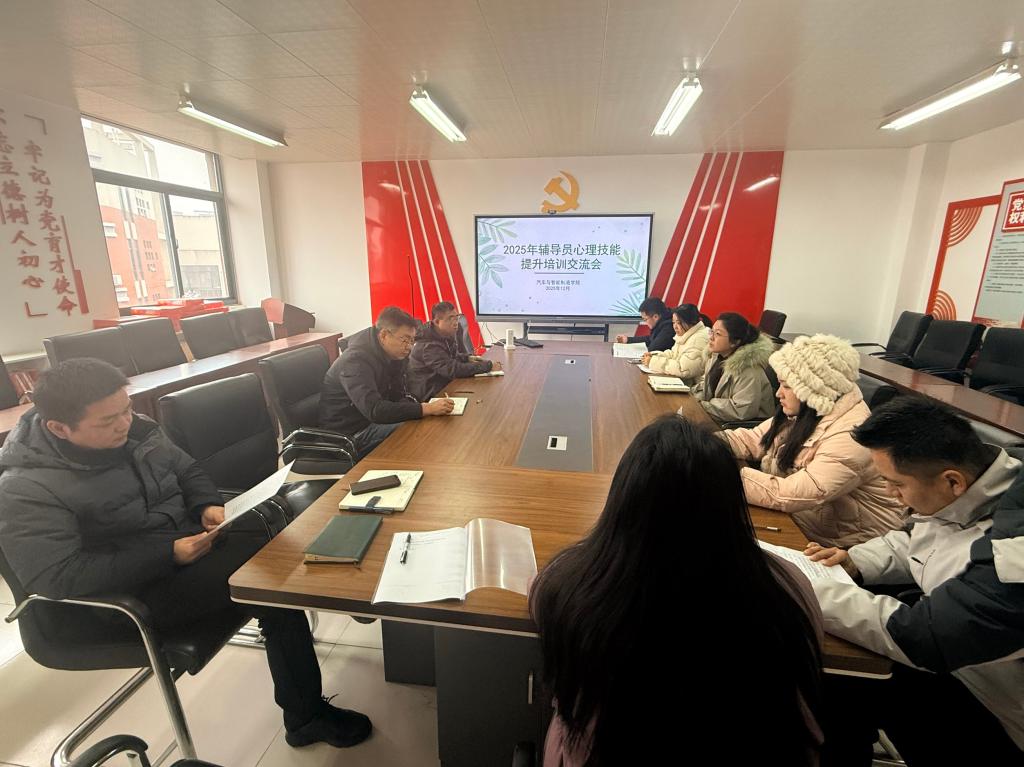 为进一步提升辅导员心理教育工作专业能力,切实筑牢学生心理健康防线,2025年12月31日,汽车与智能智造学院召开辅导员心理技能提升培训交流及案例研讨会。学院党总支书记靳春生、副院长贾屿、学工人员以及全体前期参加普通高校辅导员心理健康教育基础能力培训的辅导员参会,共同围绕培训心得、心理工作经验分享、案例研判及未来规划展开深入交流探讨。