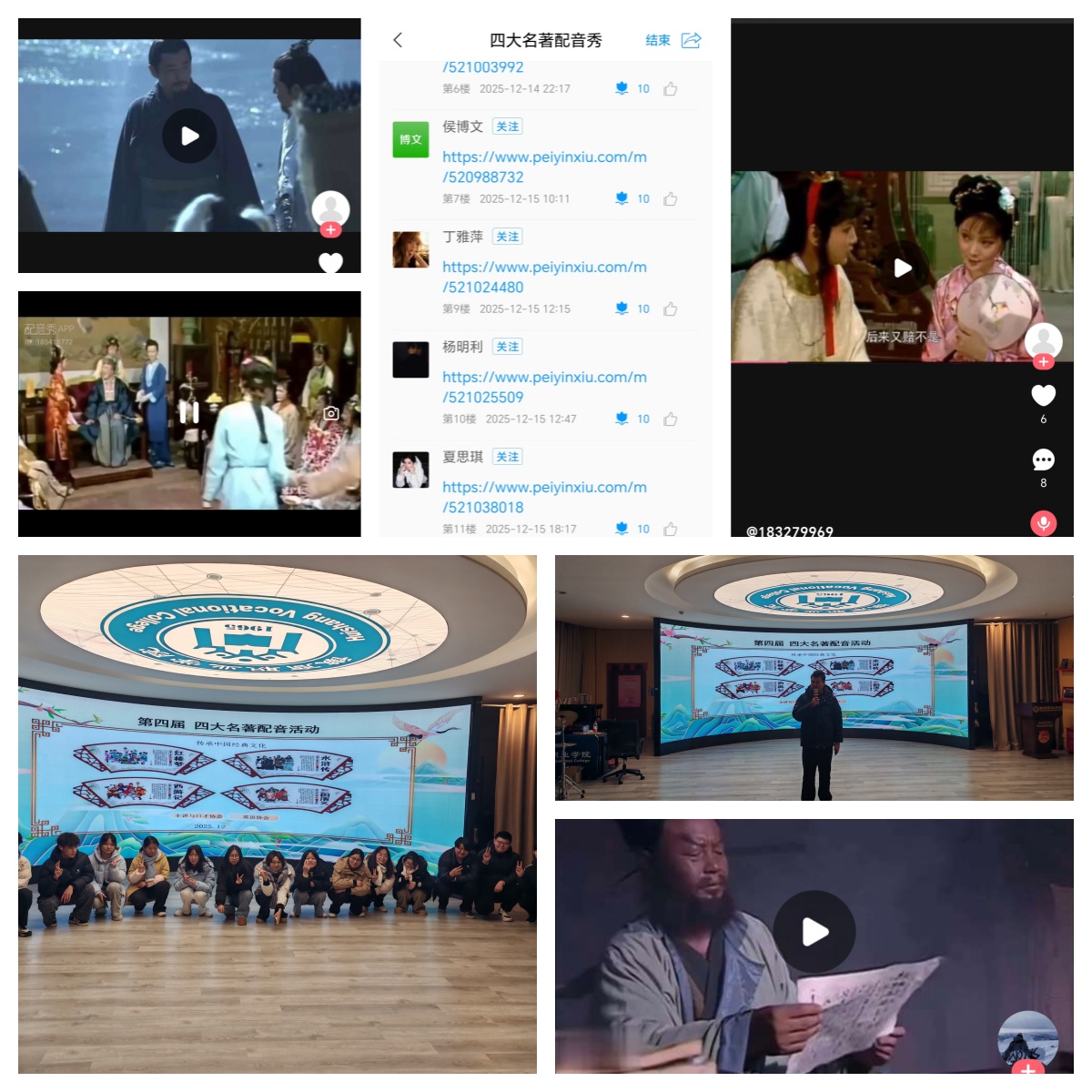 其中,第四届四大名著配音活动以“传承经典文脉”为核心主题,鼓励同学们从《红楼梦》《西游记》《三国演义》《水浒传》等经典著作中选取心仪片段进行配音创作。活动期间,参与同学通过“配音秀APP”,研读文本、揣摩角色性格与情感内核,模仿经典台词语气,将自身对角色的理解融入声音演绎之中,让经典人物形象通过声音“活”了起来。