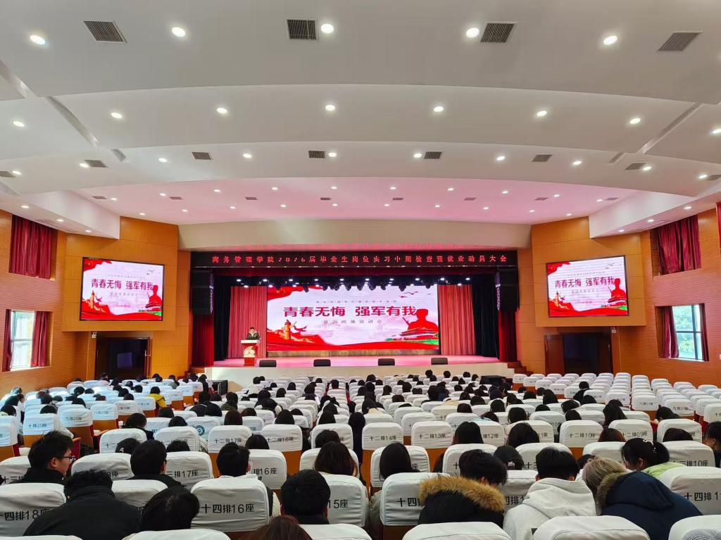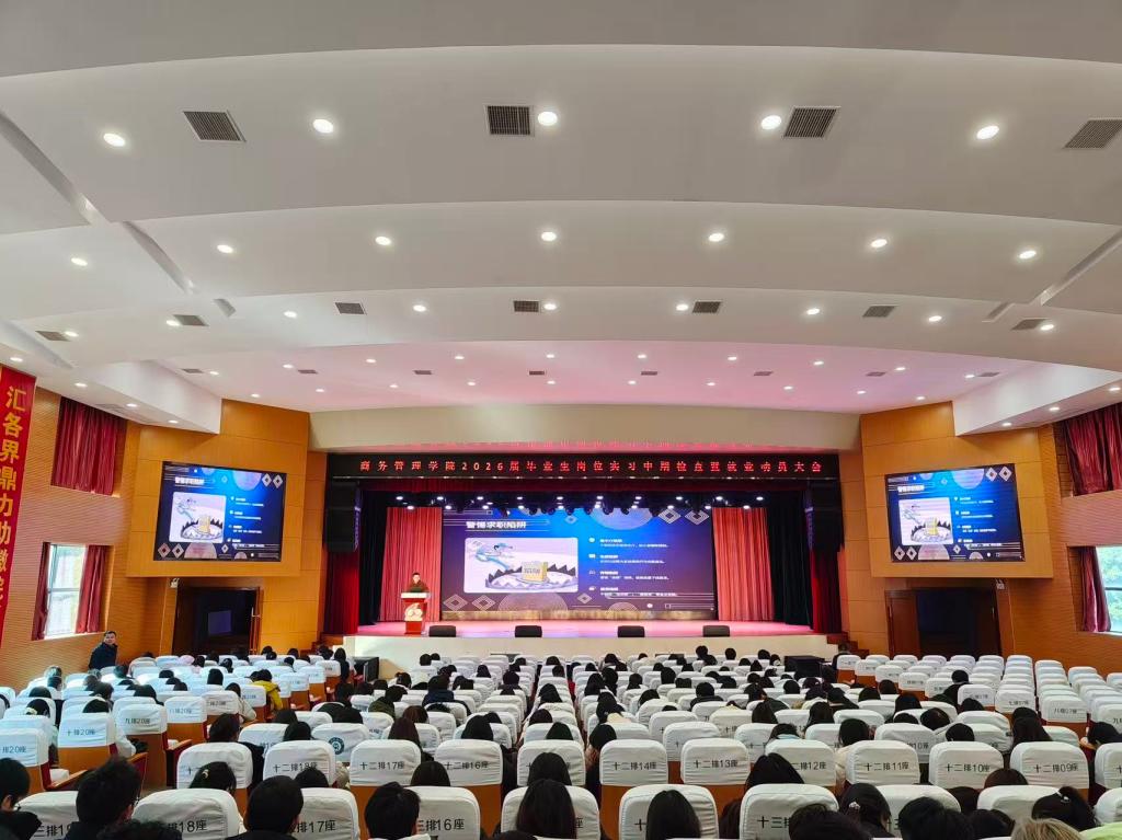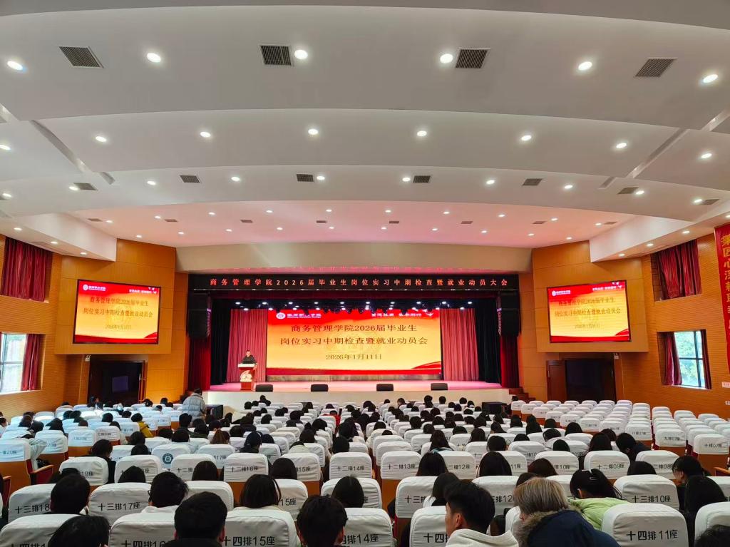 为进一步加强2026届毕业生岗位实习过程管理,扎实推进学生高质量充分就业,商务管理学院于1月11日上午召开了岗位实习中期检查暨就业动员会。学院党总支副书记(主持工作)时军林,党总支副书记、院长周永清,党总支副书记鲍骏,副院长汪红蕾、岗位实习指导教师,毕业班辅导员以及2026届返校学生300余人参加。