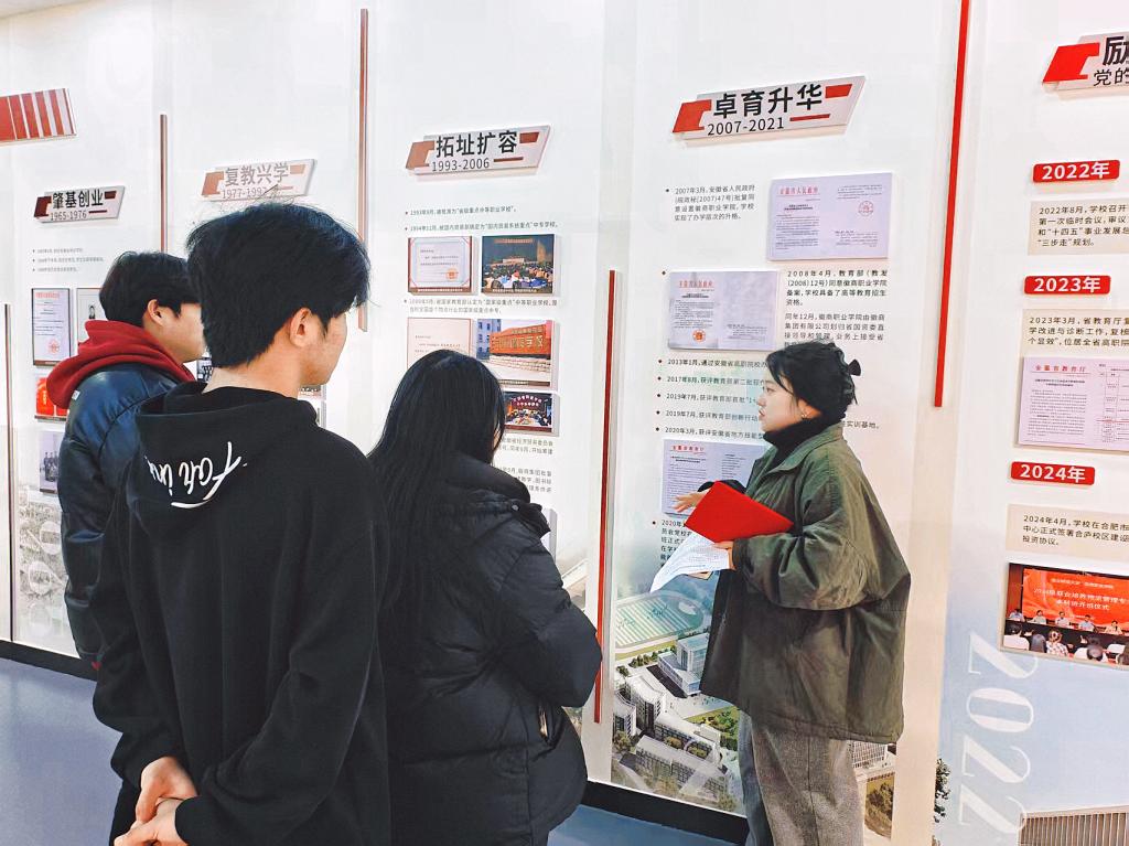 新建校史馆作为学院培育精神力量、繁荣校园文化的重要基地,系统陈列着反映办学历程的文字史料、实物展品与影像资料,从徽商文化传承到现代职业教育发展,从学科专业建设到人才培养成果,全方位展现了学院“重德弘商”的文化基因与“守正创新”的发展脉络。