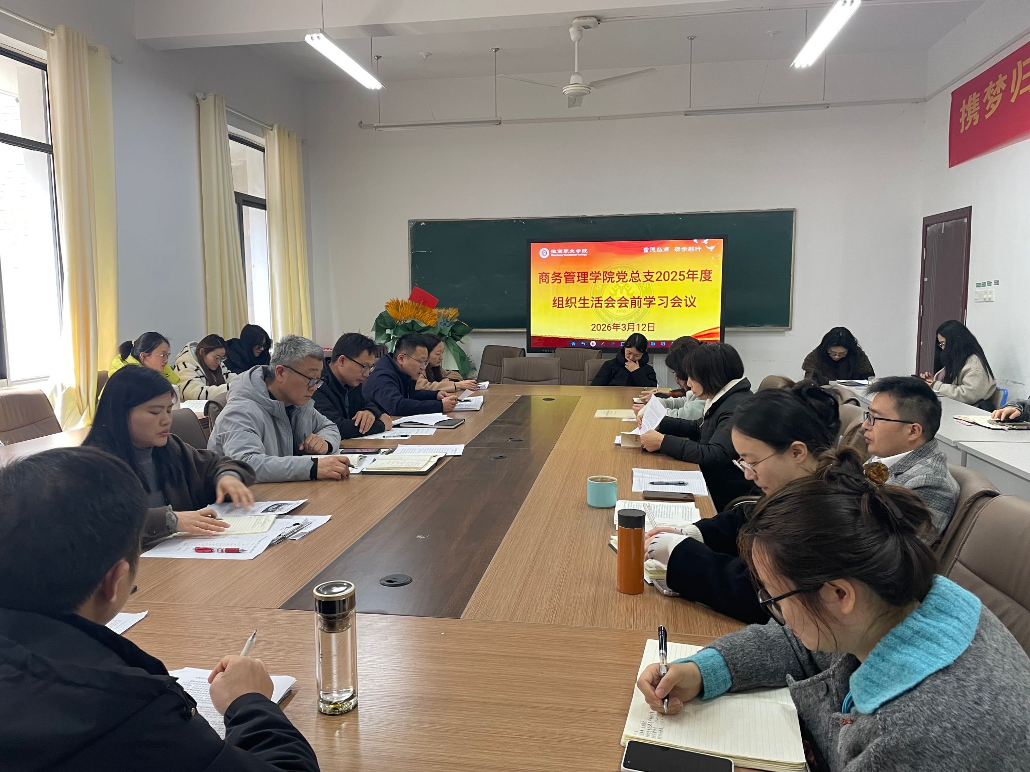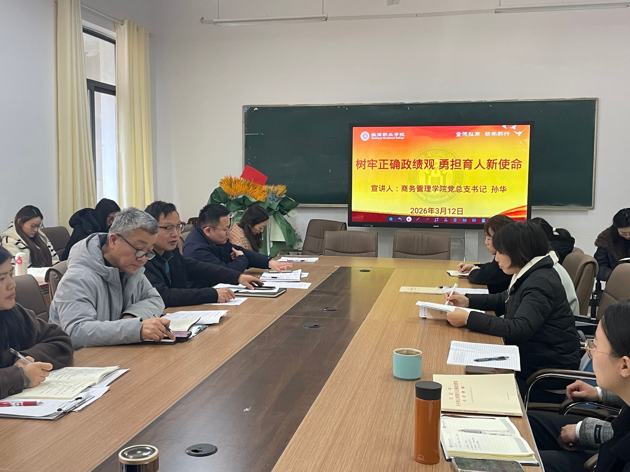3月12日中午,商务管理学院党总支在槽郢校区会议室开展树立和践行正确政绩观学习教育。学院全体教职工和学生党员参会,会议由党总支书记孙华主持。