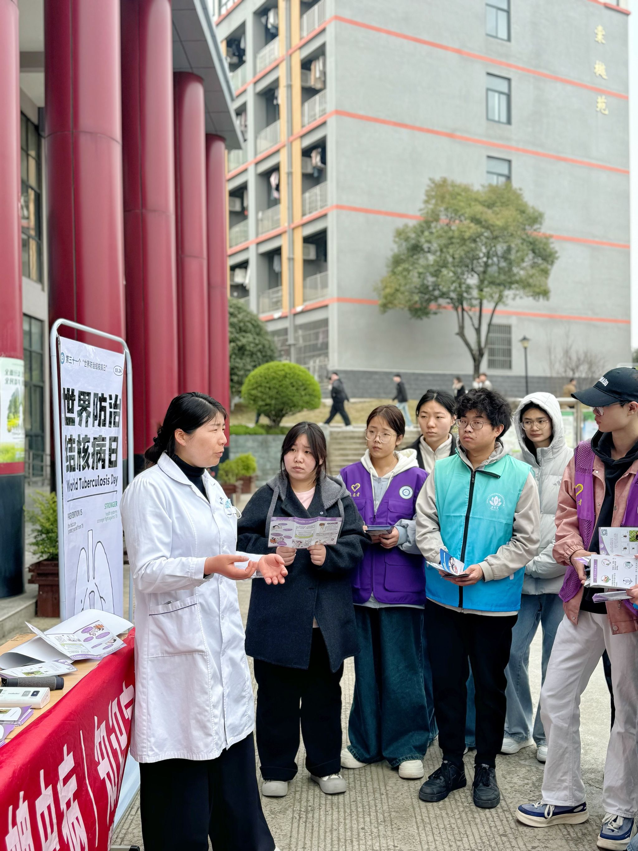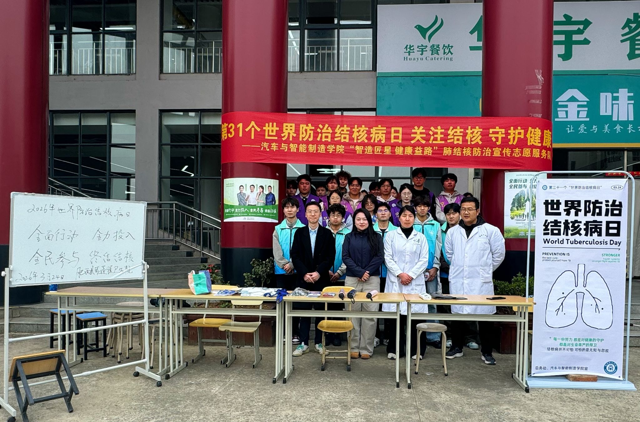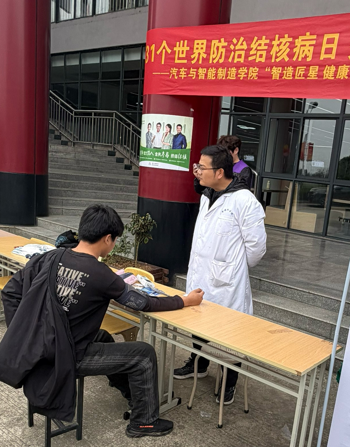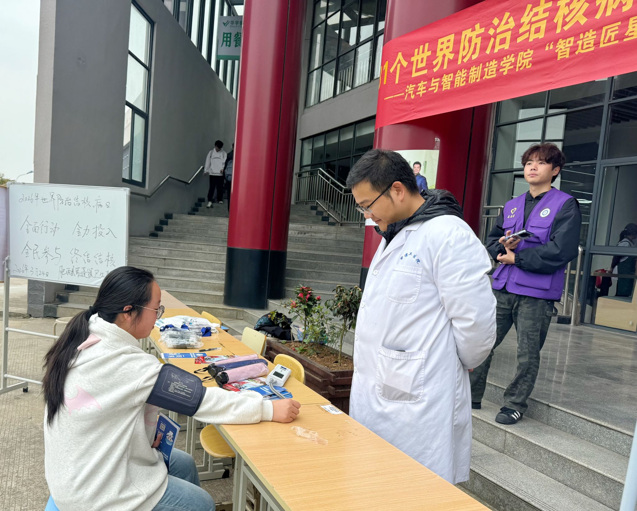 为提升师生结核病防治意识,推进应征入伍工作。3月24日,第31个世界防治结核病日当天,汽车与智能制造学院“智造匠星 健康益路”志愿服务队联合学校总务处、校医院,在紫蓬校区食堂门口开展结核病防治宣传活动暨“应征入伍”意向学生基础体检活动。本次世界防治结核病日主题为“全面行动 全力投入 全民参与 终结结核”。