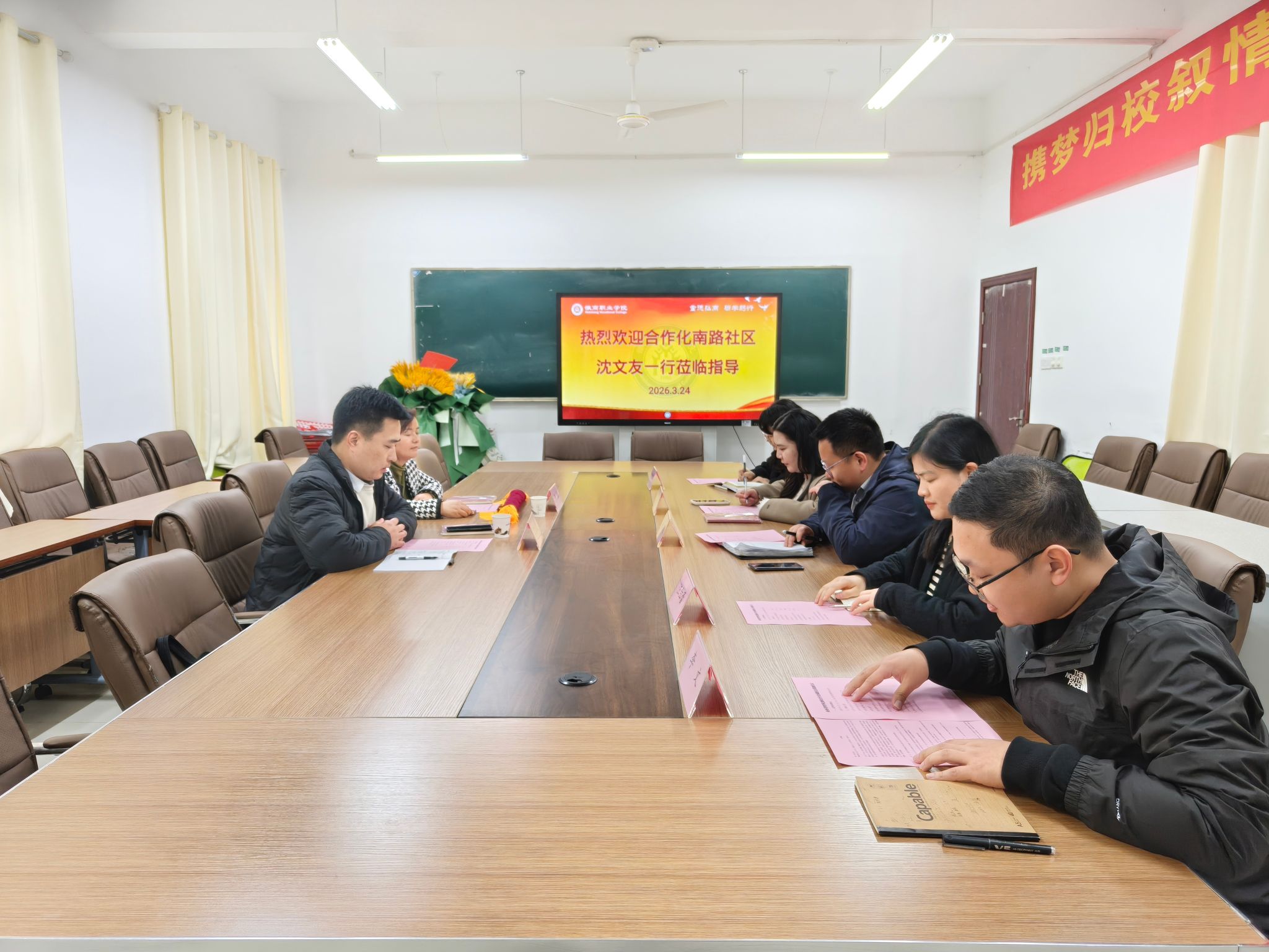 以旗为媒,共筑情谊;以心相交,共谱新篇。为深化校社合作共建、肯定商务管理学院青年志愿服务工作成效,3月24日下午,蜀山区稻香村街道合作化南路社区党委副书记沈文友、社工李纳一行,专程前往槽郢校区,为商务管理学院团总支赠送锦旗,致谢学院师生在社区开展的系列志愿服务。商务管理学院党总支副书记鲍骏、副院长汪红蕾,校团委兼职副书记张瑞,校团委委员、物流与供应链学院团总支书记刘雅晴出席活动,仪式由校团委委员、商务管理学院团总支书记李文主持。