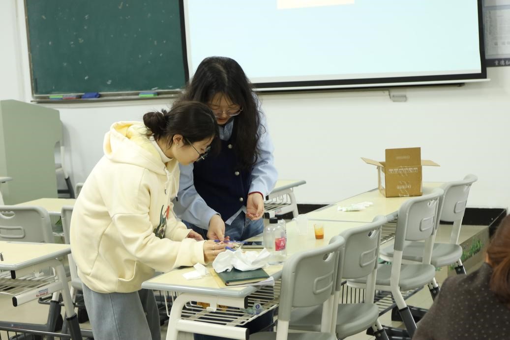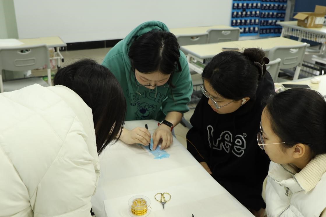 活动现场氛围温馨而热烈,新老成员围坐相伴。社团骨干成员穿梭在操作台之间,及时为新生答疑解惑、调整细节,手把手传授实操诀窍。这种“老带新、传帮带”的模式,不仅让掐丝珐琅的传统技艺得到有效传承,更让互帮互助的社团情谊在指尖缓缓流淌。
