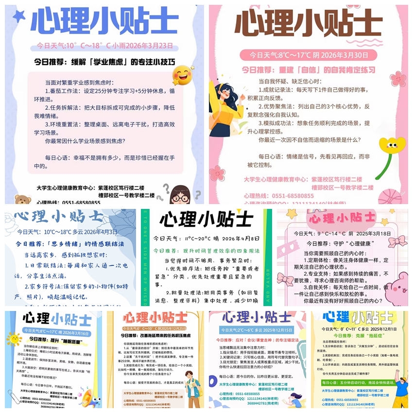 “每天早晨醒来,第一眼看到的就是班级群里那条温暖的心理小贴士,感觉一整天的情绪都有了安放之处。”这是学校不少学生的共同感受。自2022年启动以来,学校大学生心理健康教育中心(以下简称“心理中心”)坚持每日向全校各班级推送一期心理小贴士,截至2026年4月,已累计推送近600期,成为校园心理健康教育的一项常态化、品牌化工作。