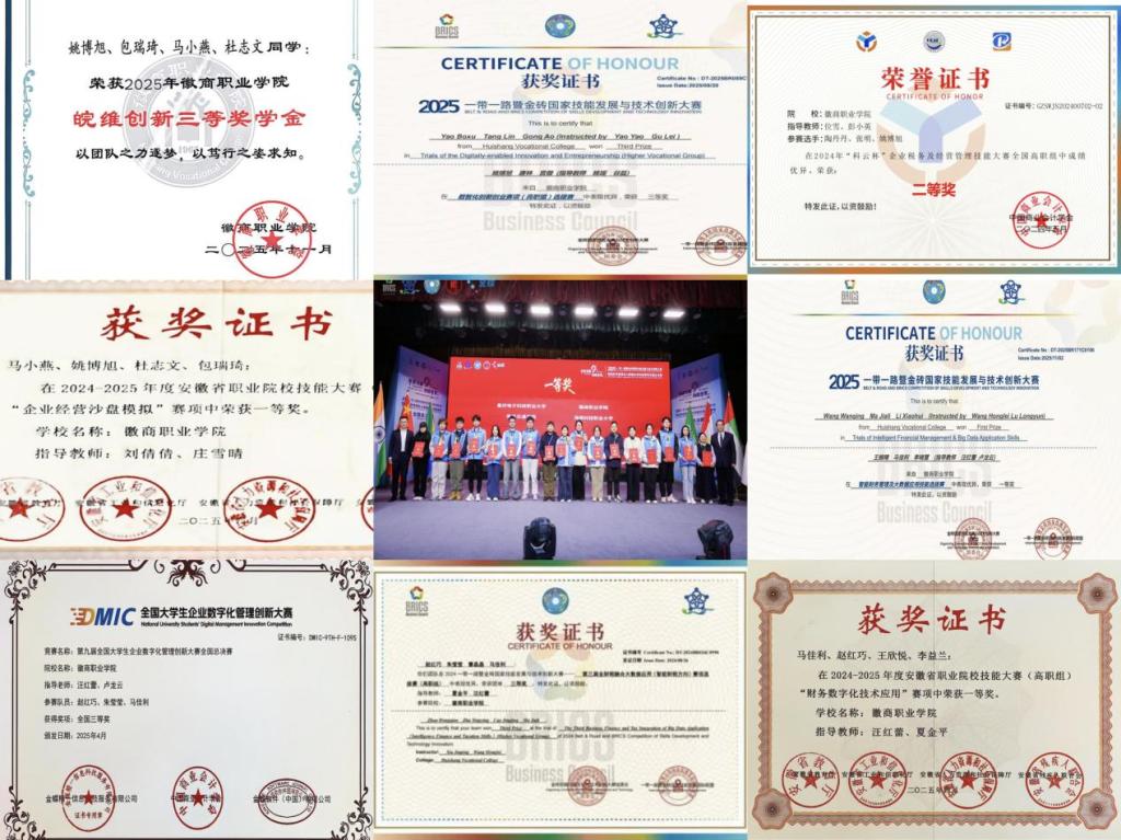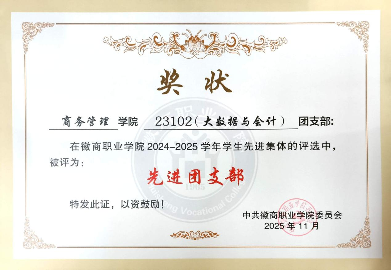 班级始终秉持“勤学、善思、笃行、争优”的班风,着力营造互帮互助、比学赶超的优良学习氛围,同学们学习热情高涨、进取意识强烈,在大一时班级无旷课现象,出勤率始终保持在95%以上,班风学风优良。在团支部班子的带领下,学业考证方面捷报频传:9名同学已取得初级会计专业技术资格证书,11名同学通过普通话等级考试,计算机一级证书全班通过率高达97%,扎实的专业基础为未来成长成才筑牢根基。竞赛赛场尽显风采,班级学子奋勇争先、屡创佳绩:目前班级已有8名同学通过技能比赛取得免试专升本笔试资格,其中,团支书马佳利同学荣获第三届财税融合大数据应用(智能财税方向)赛项选拔赛(高职组)三等奖,第九届“科云杯”全国大学生财会职业能力大赛三等奖,第九届全国大学生企业数字化管理创新大赛区域赛一等奖、全国总决赛三等奖,2024年“中银杯”安徽省职业院校技能大赛(高职组)财务数字化技术应用赛项一等奖,2025年一带一路暨金砖国家技能发展与技术创新大赛智能财务管理及大数据应用技能赛项全国总决赛一等奖等多项荣誉;组织委员赵红巧在荣获2024-2025学年度本专科生国家奖学金;团员代表姚博旭、马佳利、赵红巧等人拿下多项皖维创新奖学金,以实干实绩彰显班级勤学善研、奋勇争先的优良学风。