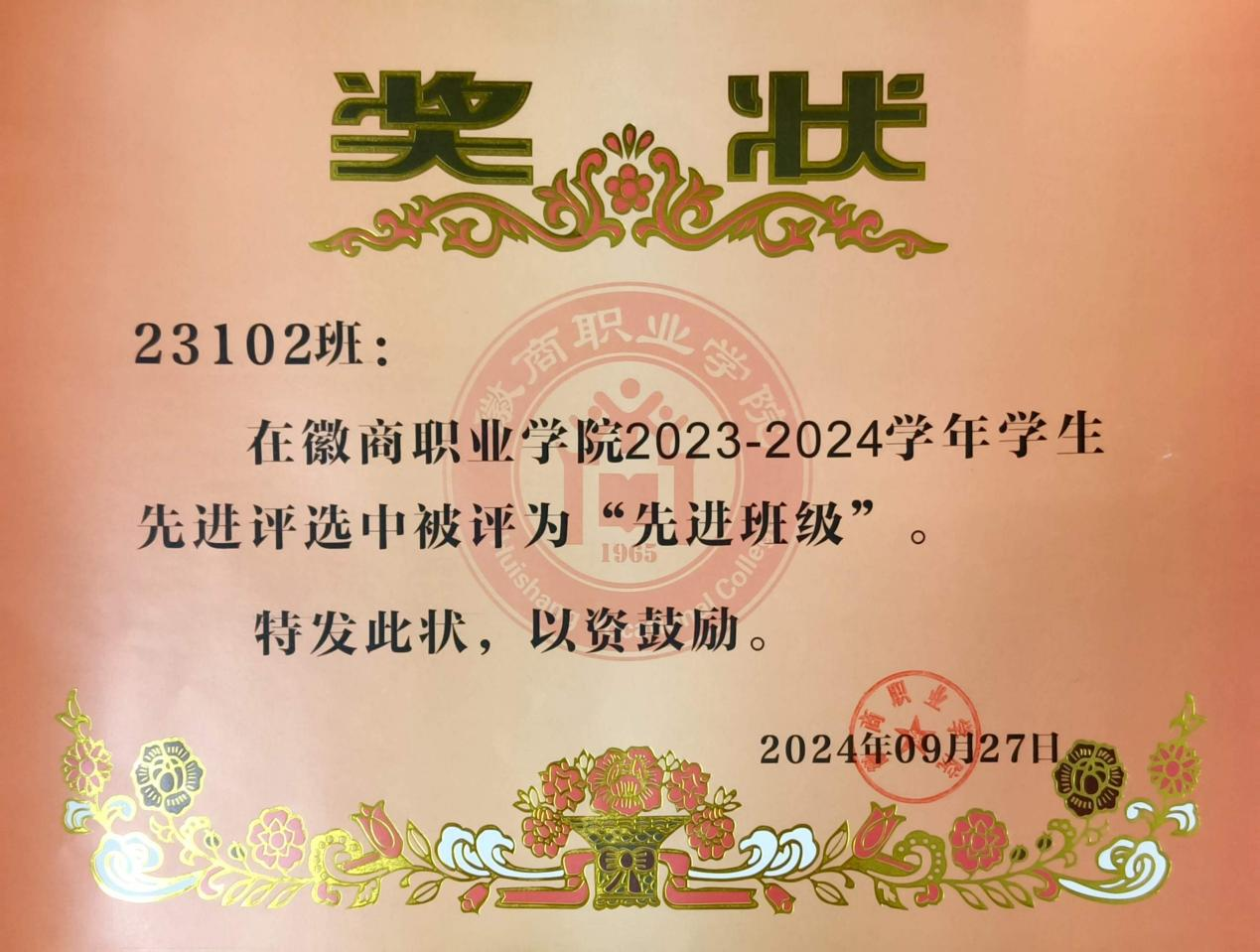 图6:23102班荣获2023-2024学年“先进班级”