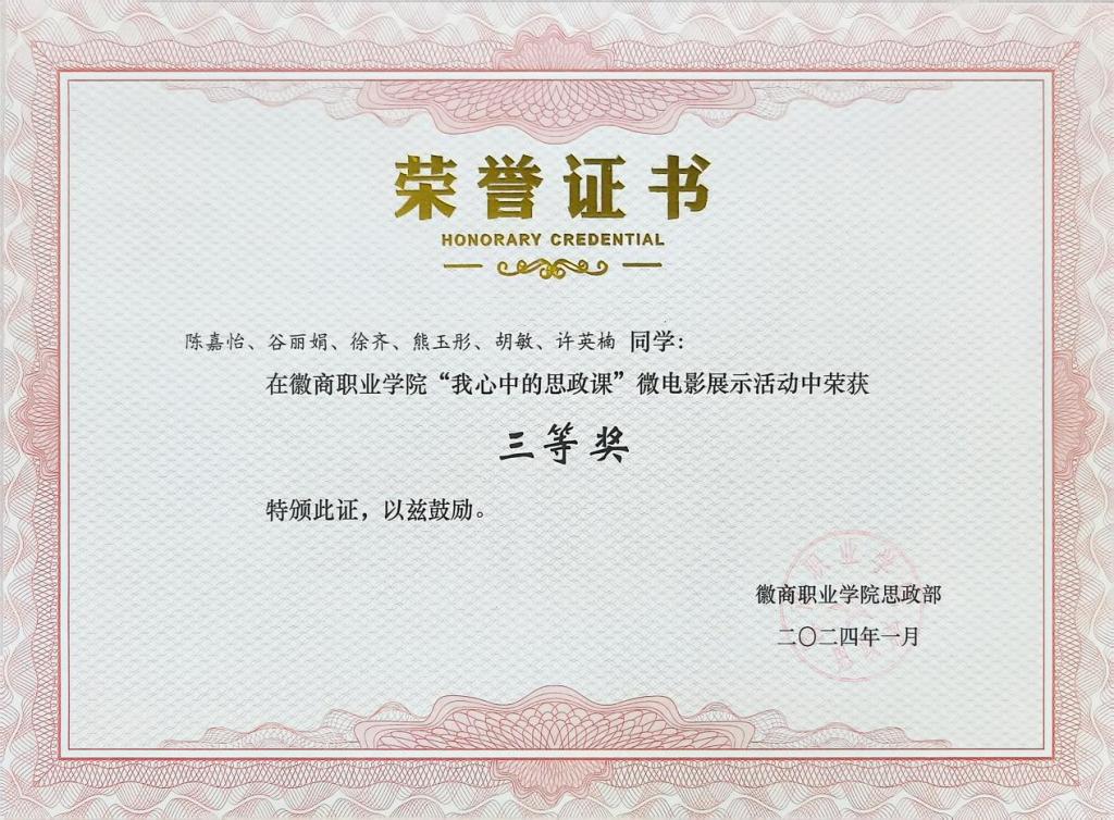 图3:23102班学生代表荣获“我心目中的思政课”微电影展示活动“三等奖”
