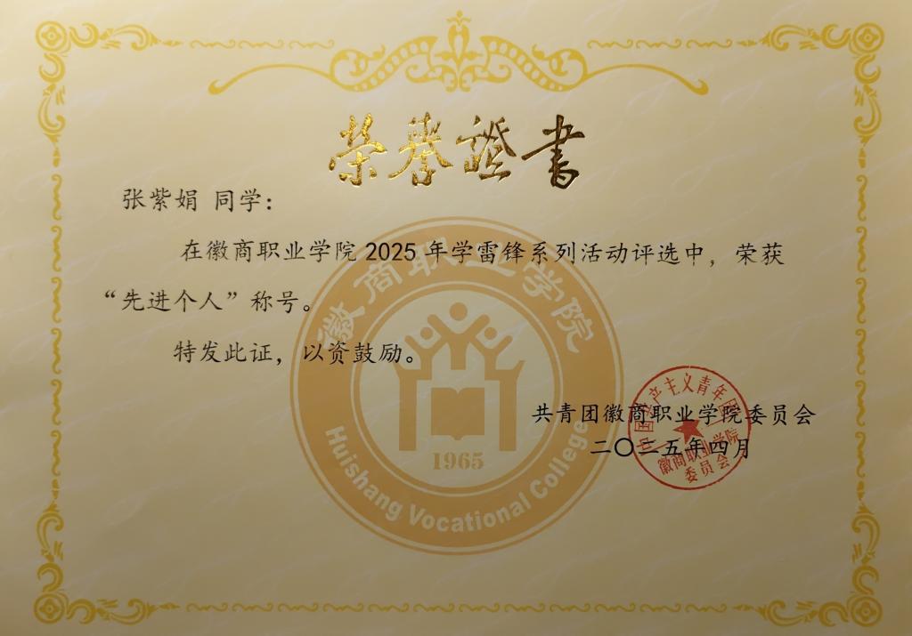 获得国家励志奖学金后,她更积极投身志愿服务,在学雷锋活动中获评“先进个人”,并组织团队深入社区、学校开展服务。作为学生会主席团成员,她始终秉持服务同学的宗旨,积极帮助师生解决问题,并在2024-2025学年荣获“优秀学生”“优秀团员”“优秀学生干部”等多项称号,以实际行动诠释了学生骨干的先锋模范作用。