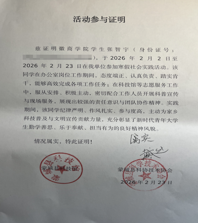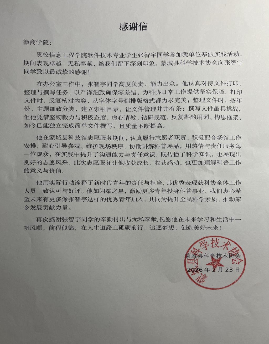 在张智宇同学寒假“返家乡”政务实践圆满结束之际,蒙城县科学技术协会特致感谢信,对他实践期间展现出的过硬素质、优异表现与无私奉献精神,致以最诚挚的谢意和最高度的认可。