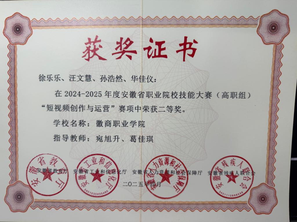 以赛促学强本领,以赛促练增才干。为实现专业能力与综合素养的双向提升,该学子主动跳出舒适区,聚焦专业核心领域,积极投身各类高水平竞赛。她凭借扎实的专业功底与创新的思维模式,在赛场上崭露头角:斩获第十一届“挑战杯”安徽省大学生课外学术科技作品竞赛AIGC视觉创意专项赛省级一等奖、全国大学生广告艺术大赛省级二等奖及国家优秀奖、安徽省职业技能大赛短视频创作与运营赛道二等奖、安徽省WPS办公软件应用能力大赛团体银奖及省级三等奖、大学生英语竞赛省级一等奖、全国大学生英语词汇能力大赛省级三等奖等多项荣誉。