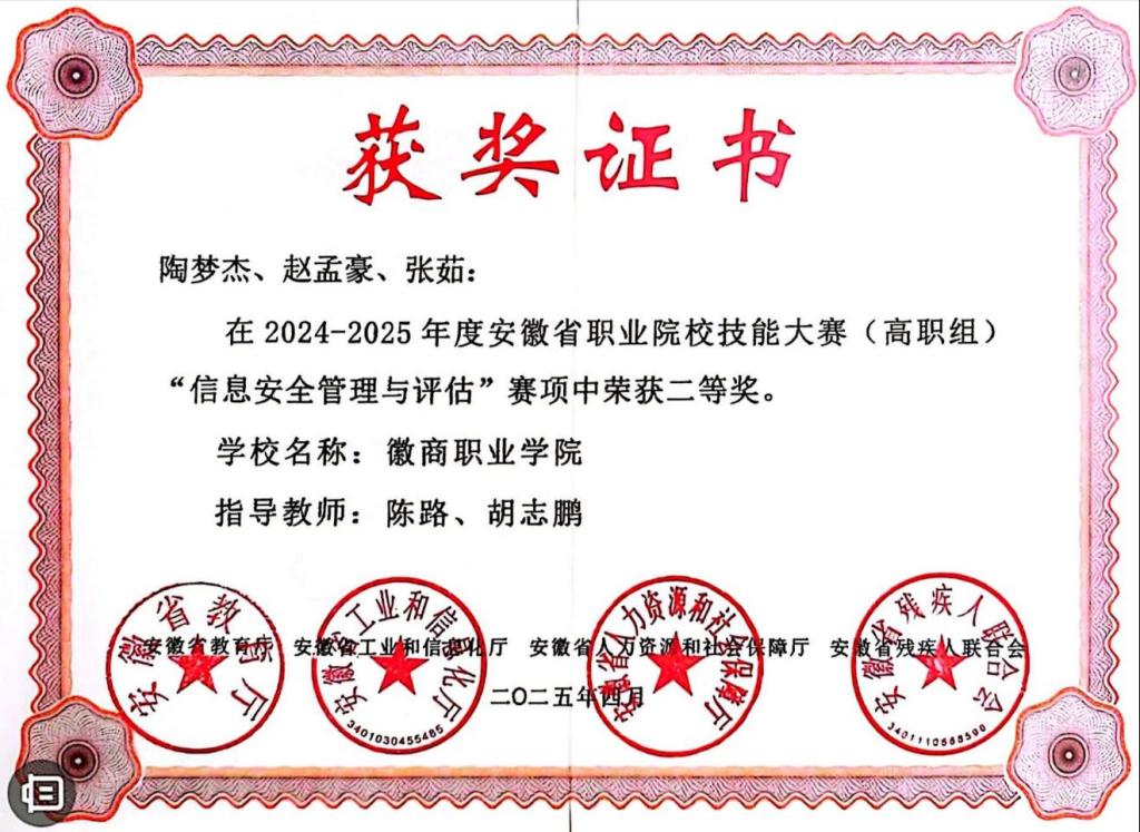志之所趋,无远勿届。在学业上,赵孟豪始终秉持严谨务实的治学态度,深耕专业领域,注重理论与实践的深度融合。他不满足于课堂所学,主动探索专业知识的广度与深度,将抽象的理论知识转化为解决实际问题的能力。在辅导员的悉心引领下,他积极投身各类学科竞赛,在赛场中锤炼创新思维与攻坚能力。凭借扎实的专业功底与不懈的努力,他斩获多项省级荣誉:2024年安徽省职业院校技能大赛“信息安全管理与评估”赛项二等奖、2025年全国大学生信息安全竞赛安徽省赛三等奖、2025年安徽省工业和信息化行业职业技能大赛信息测试员赛项三等奖;在综合素质测评中,他同样表现优异,2023-2024学年获国家励志奖学金、学院一等奖学金、三好学生、优秀团员;2024-2025学年获唐功学弘志奖学金、学院二等奖学金;2025-2026学年荣获优秀毕业生。在技能认定中,他先后获得“1+X”网络系统建设与运维(中级)、“1+X”WPS办公应用(中级)和HCIA职业技能等级证书。因表现优秀,赵孟豪被推荐到安徽数安系统集成有限公司开展岗位实习。